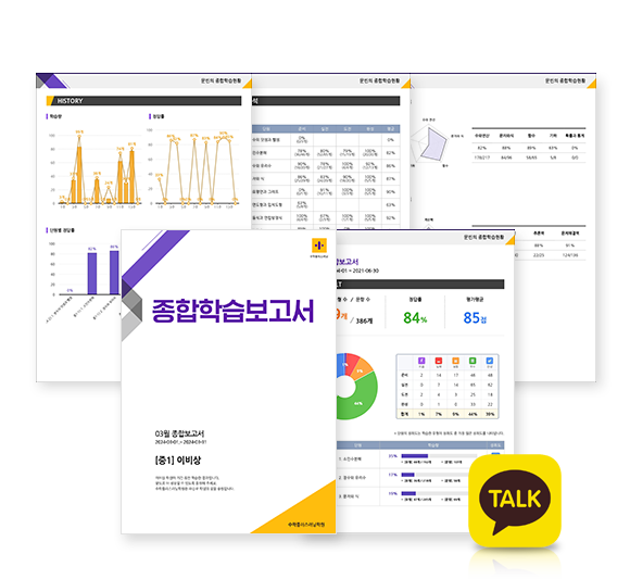 종합보고서 선생님께서는 오직 수업에만 집중하세요 학습 데이터 관리와 종합 보고서는 수학플러스러닝이 책임지겠습니다 수려한 인포그래픽스로 보기 좋게 학습 결과를 전달하고, 간단한 학습 현황은 카카오톡으로 편하게 쓱- 보내보세요 고등내신·수능 이용후기